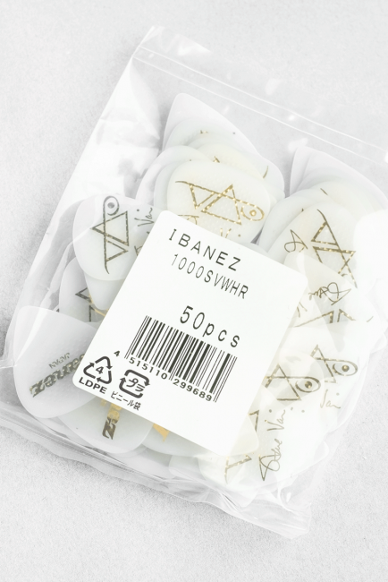 Iso plektra isoille käsille. Katsopa tarkkaan Steve Vain käsiä ja huomaat, että herran hanska on mittava. Steven nimikkoplektra (jolla hän käsittääksemme oikeasti soittaakin) on myös hieman Ibanezin perusmalleja suurempi, lähinnä pituudeltaan. Kärki on keskiterävä ja malli muistuttaa ehkä eniten Tortex TIII -plektraa. Valkoisessa mallissa on Ibanezin Rubber Grip -plektroista tuttu kumi-grip. Pleku siis pysyy kädessä vaikka meno äityisi hikiseksikin.- Pussissa 50kpl plektroja