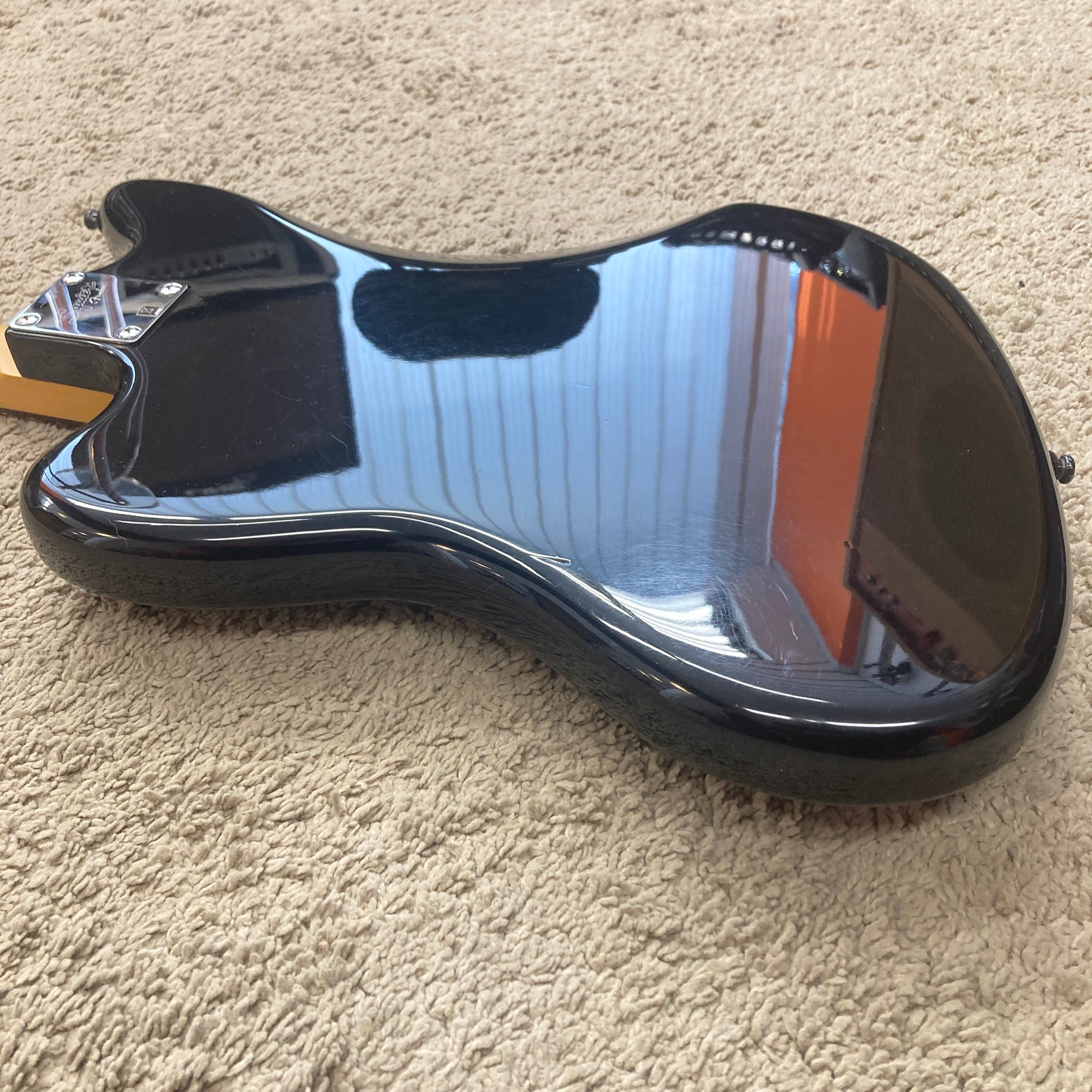 This Jazzmaster has been professionally refinished in black by a guitar technician, giving it a sleek, classic look that suits the iconic offset body shape perfectly. The finish work has been done cleanly and tastefully, making the instrument stand out while retaining its original character.